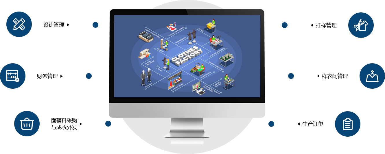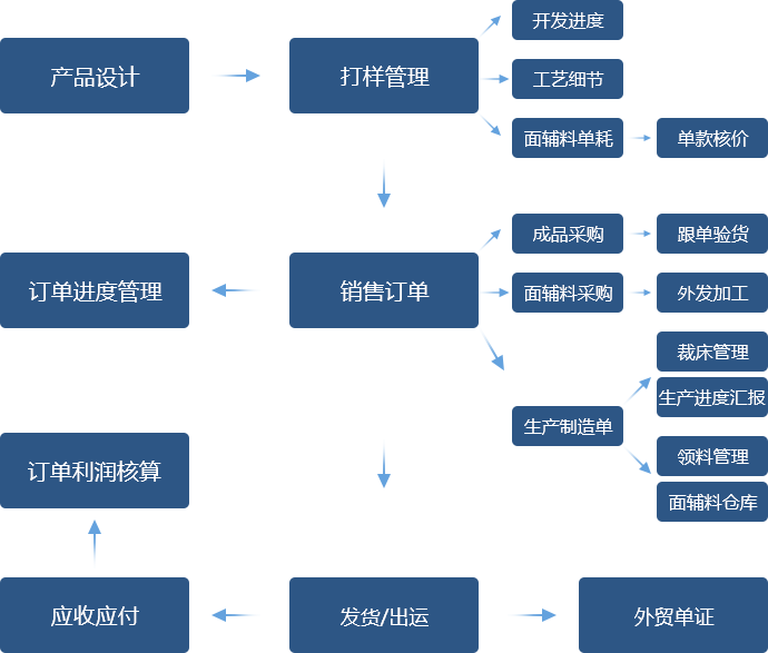 成衣內(nèi)銷、成衣外銷、面輔料需求計(jì)算、面料采購、輔料采購、成衣經(jīng)銷采、面料庫存、輔料庫存、領(lǐng) 料管理、成衣庫存、收付款管理。